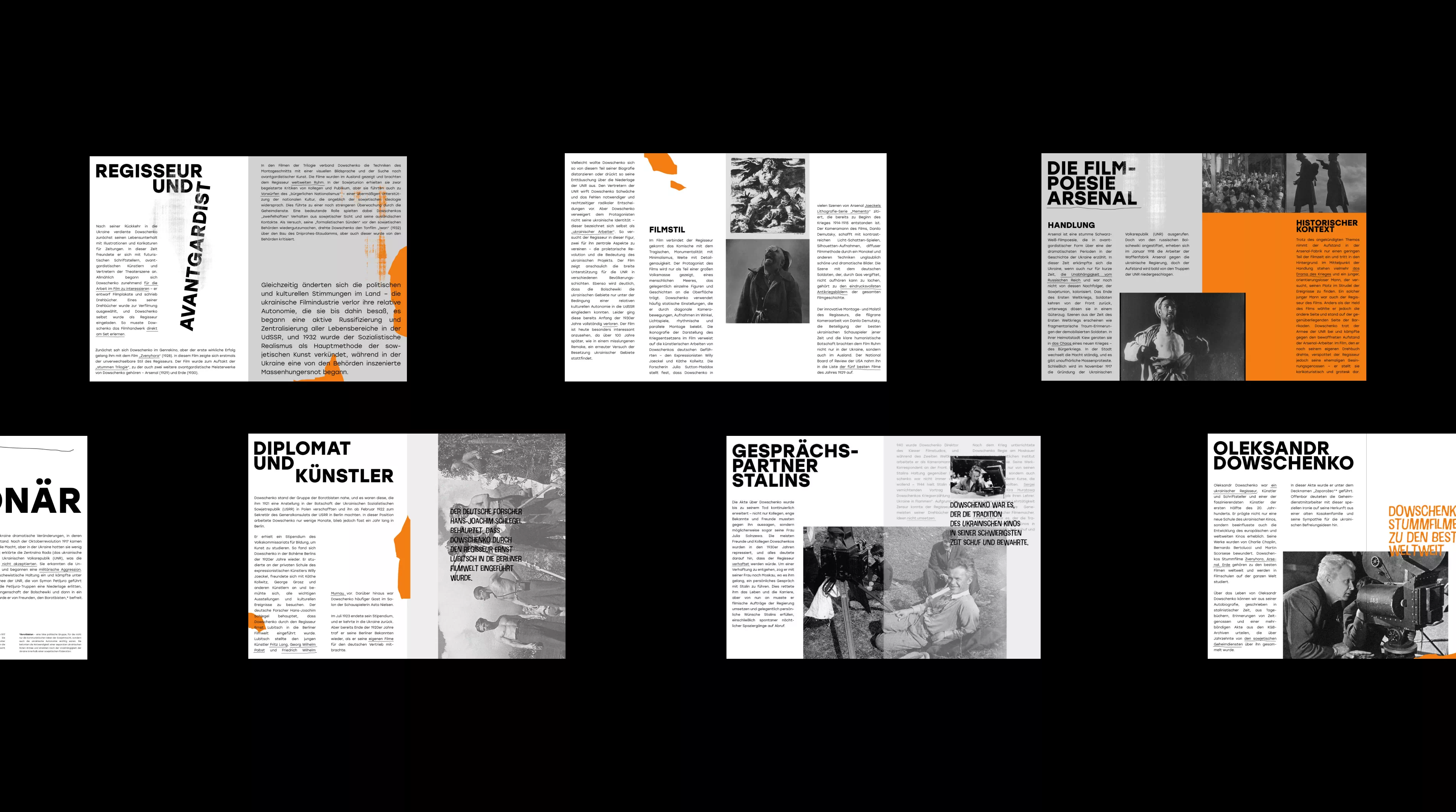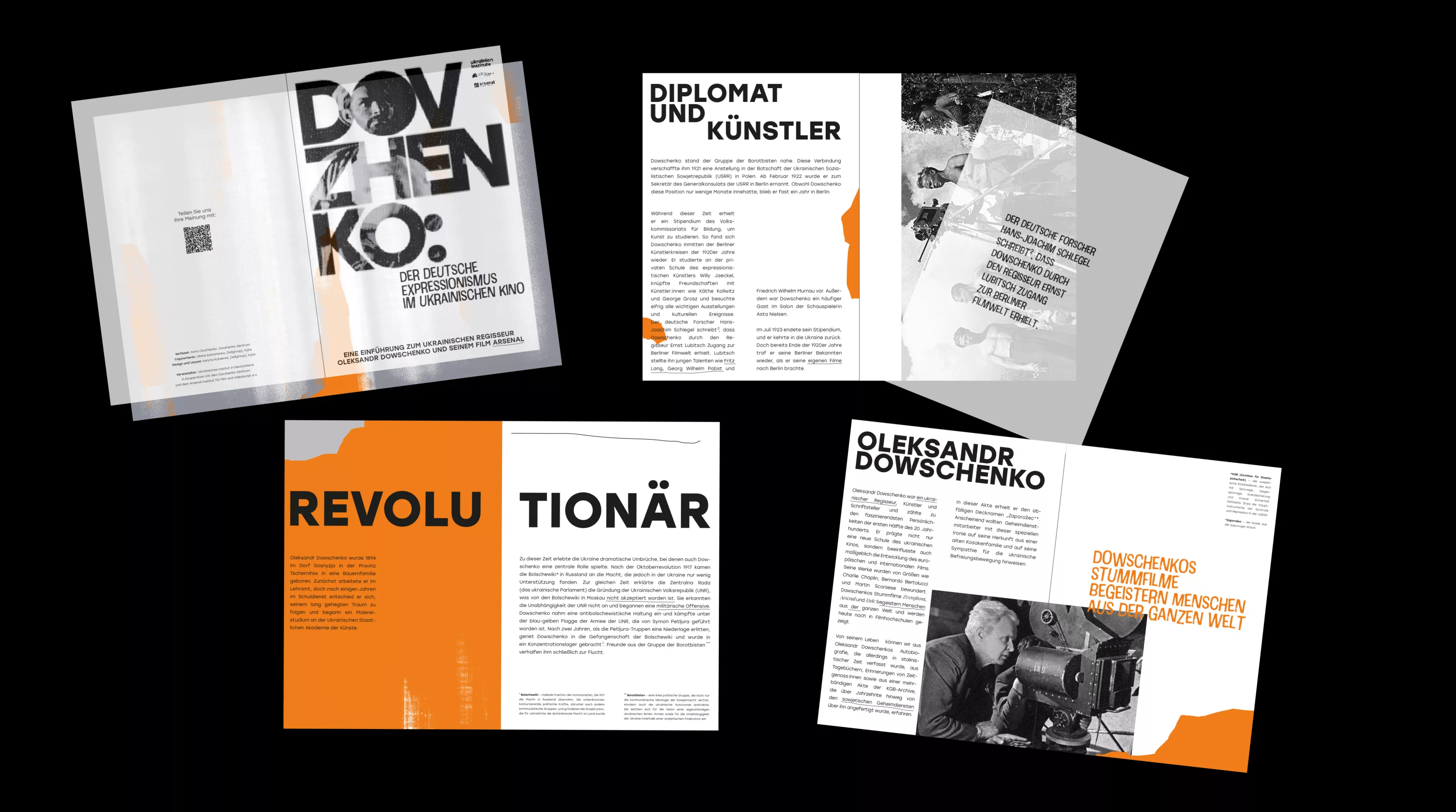 Solution The primary challenge was to bridge the raw expression of 1920s Ukrainian avant-garde with a contemporary aesthetic for a European audience. The developed identity, featuring posters and a multi-page booklet, relies on a striking black-and-white contrast with a vibrant orange accent—referencing the beam of a cinema projector. The dynamic, fragmented typography within the booklet acts as an independent visual element, echoing Oleksandr Dovzhenko’s complex journey and his struggle against censorship.