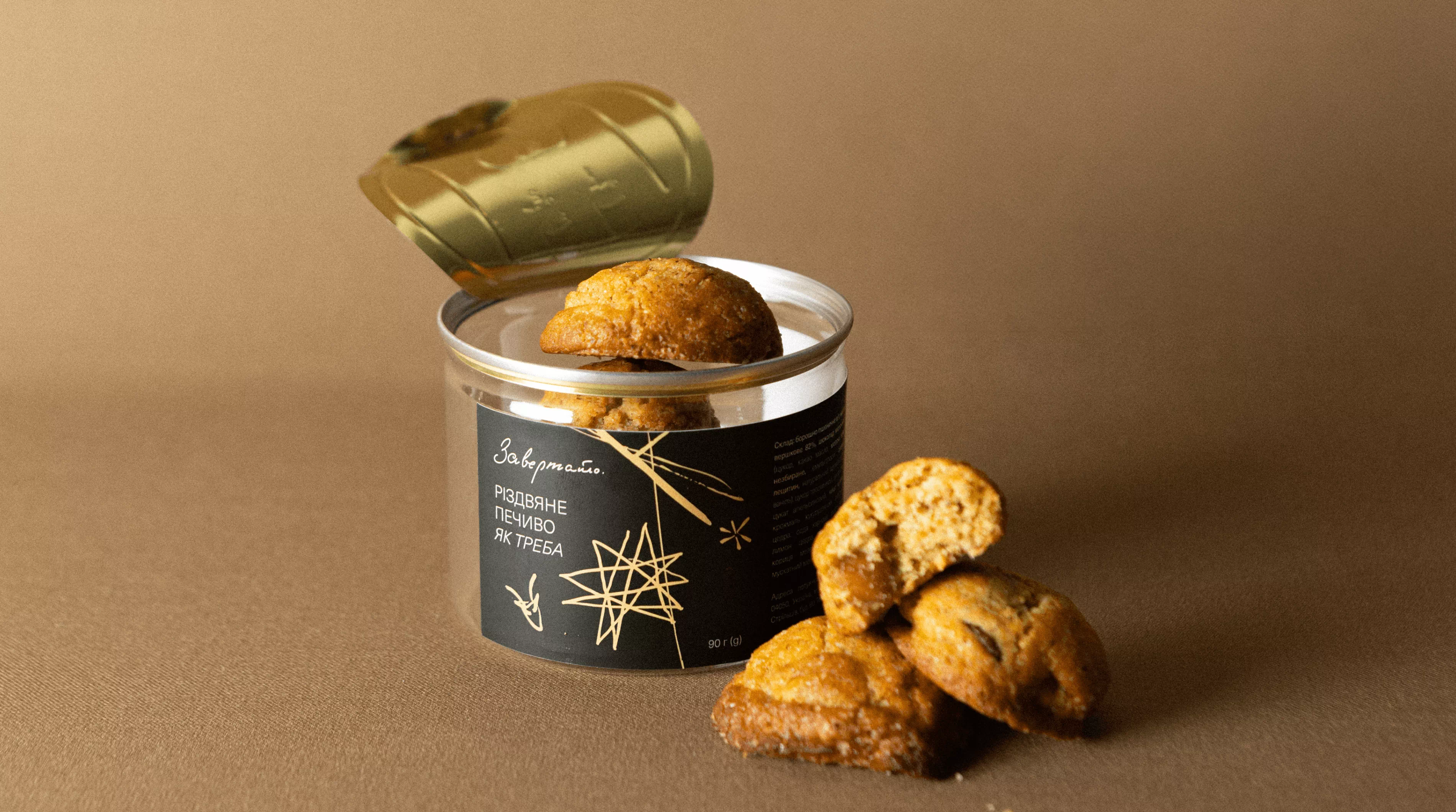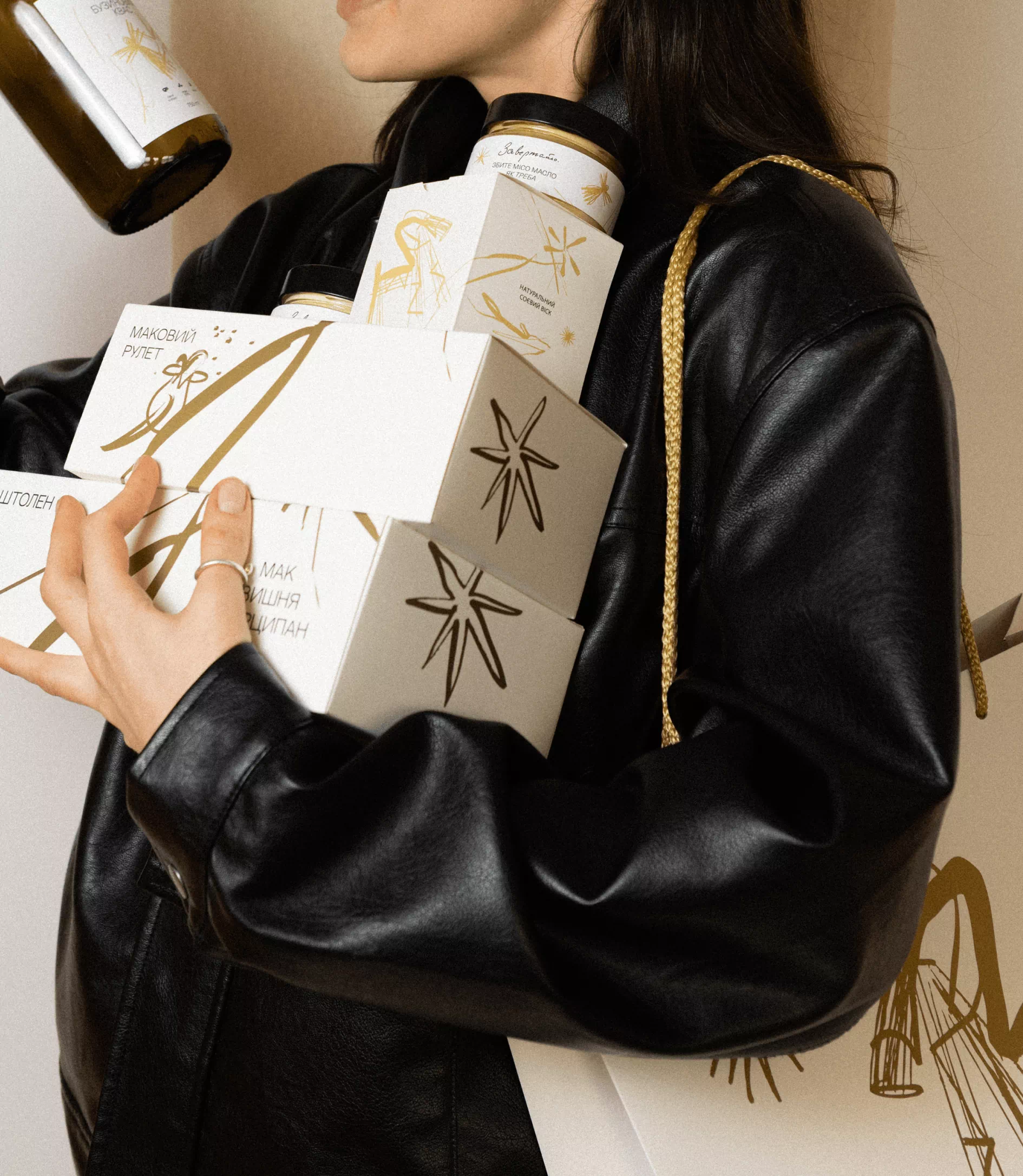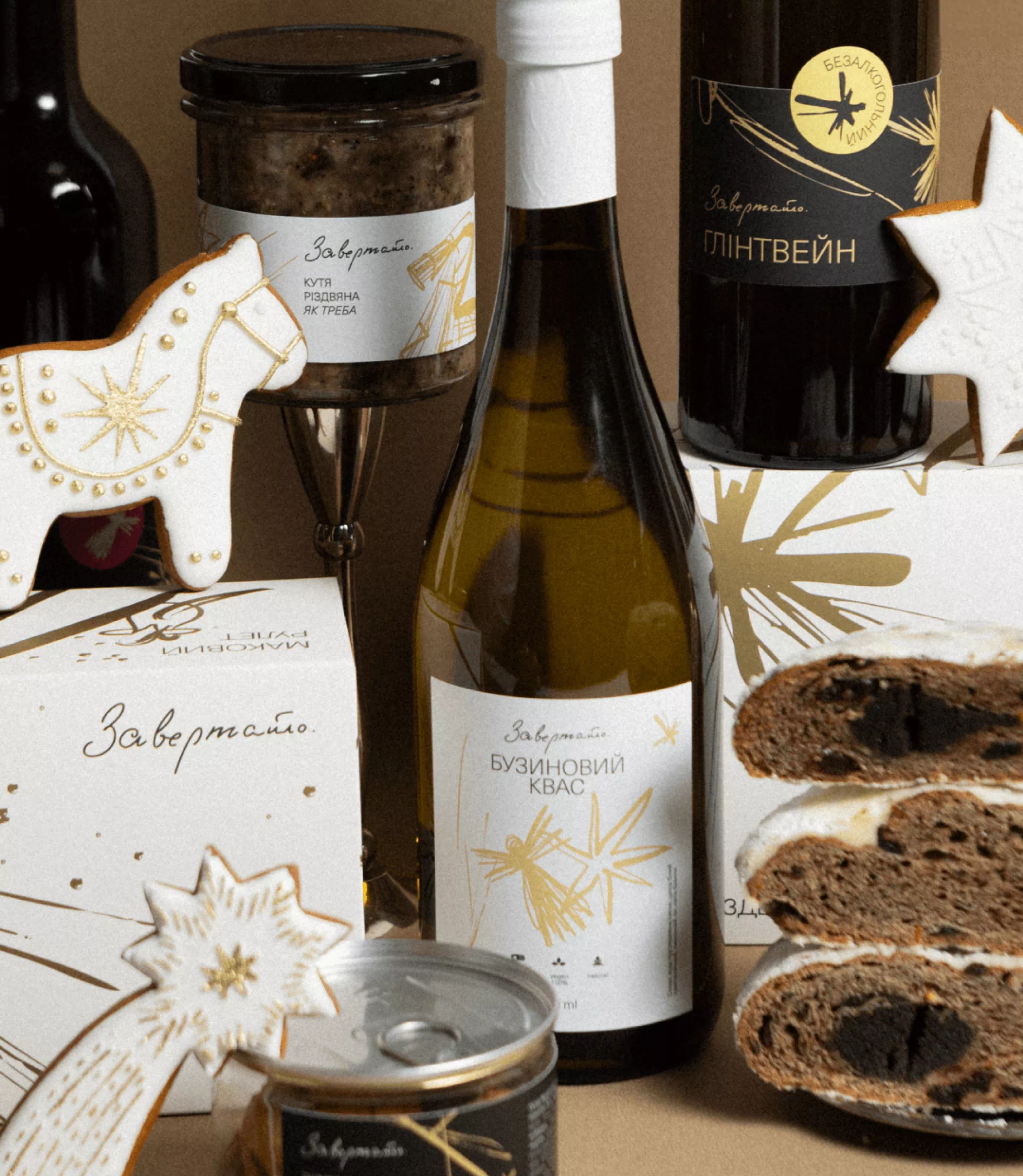 The packaging system is built on a contrast of black and white with gold accents. The graphics ‘cut through’ dark surfaces and continue onto light ones, symbolizing the transition from night to day. Every element—from stollen boxes to beverage labels—became part of a cohesive narrative about a vibrant, character-driven Christmas.